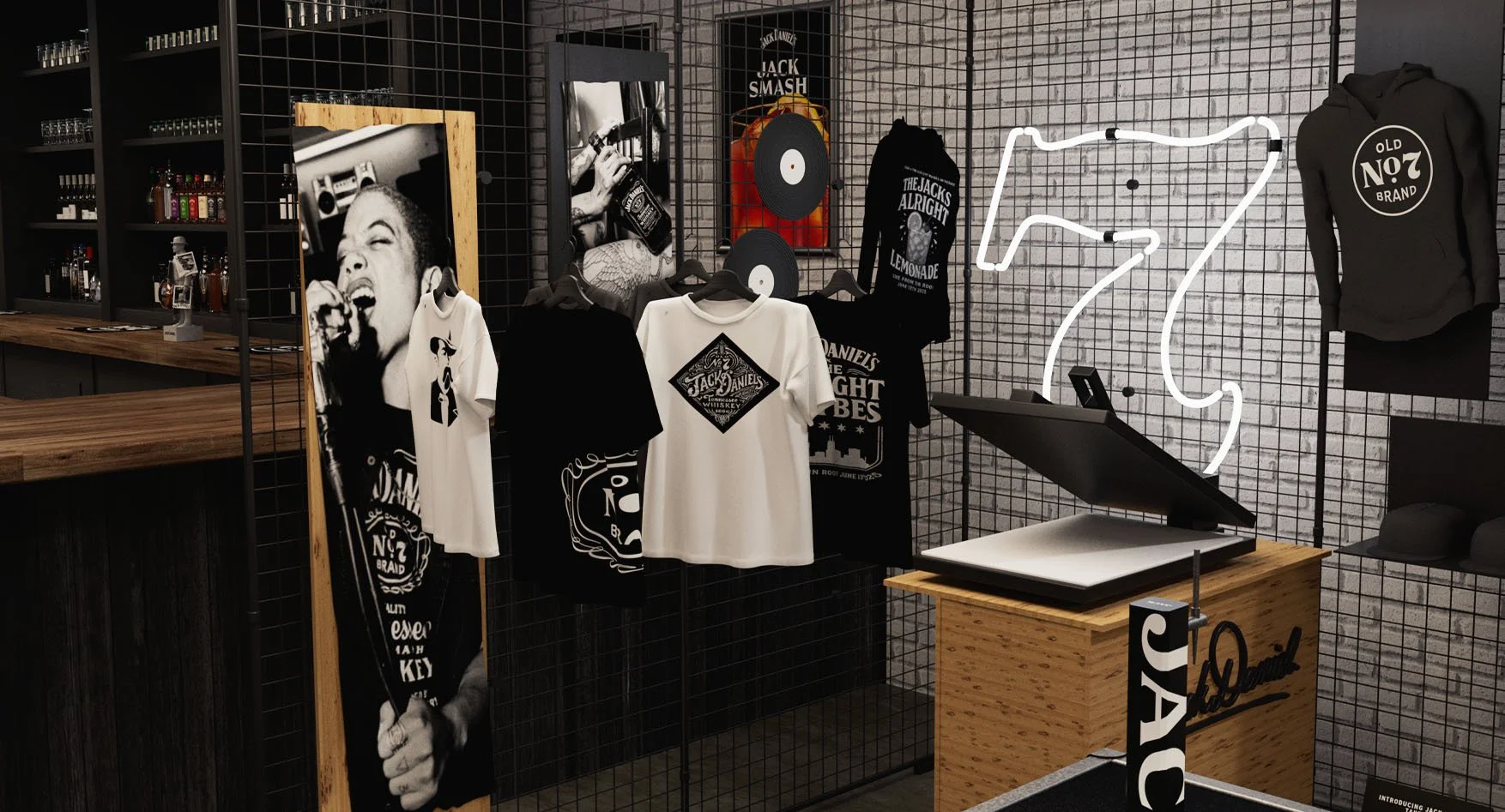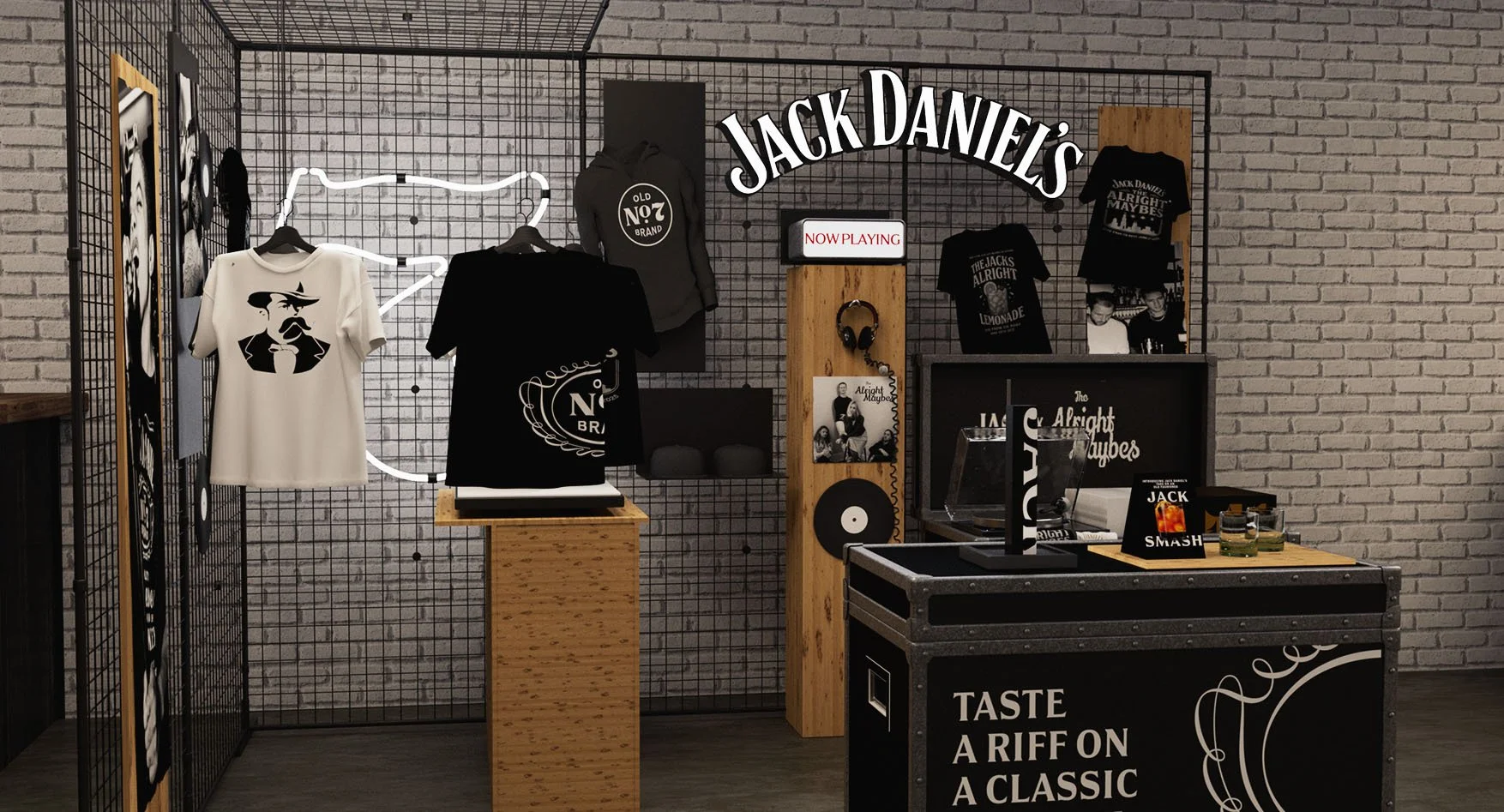 A collection of scalable spaces that can be used for different occasions and carrying sizes of venue. The designs allow Jack to connect with consumers on their terms whilst enjoying the bar they love to the full. Customer can tune in to content, buy merch and get t-shirts printed while watching a game or catching a gig with a Jack serve in hand.