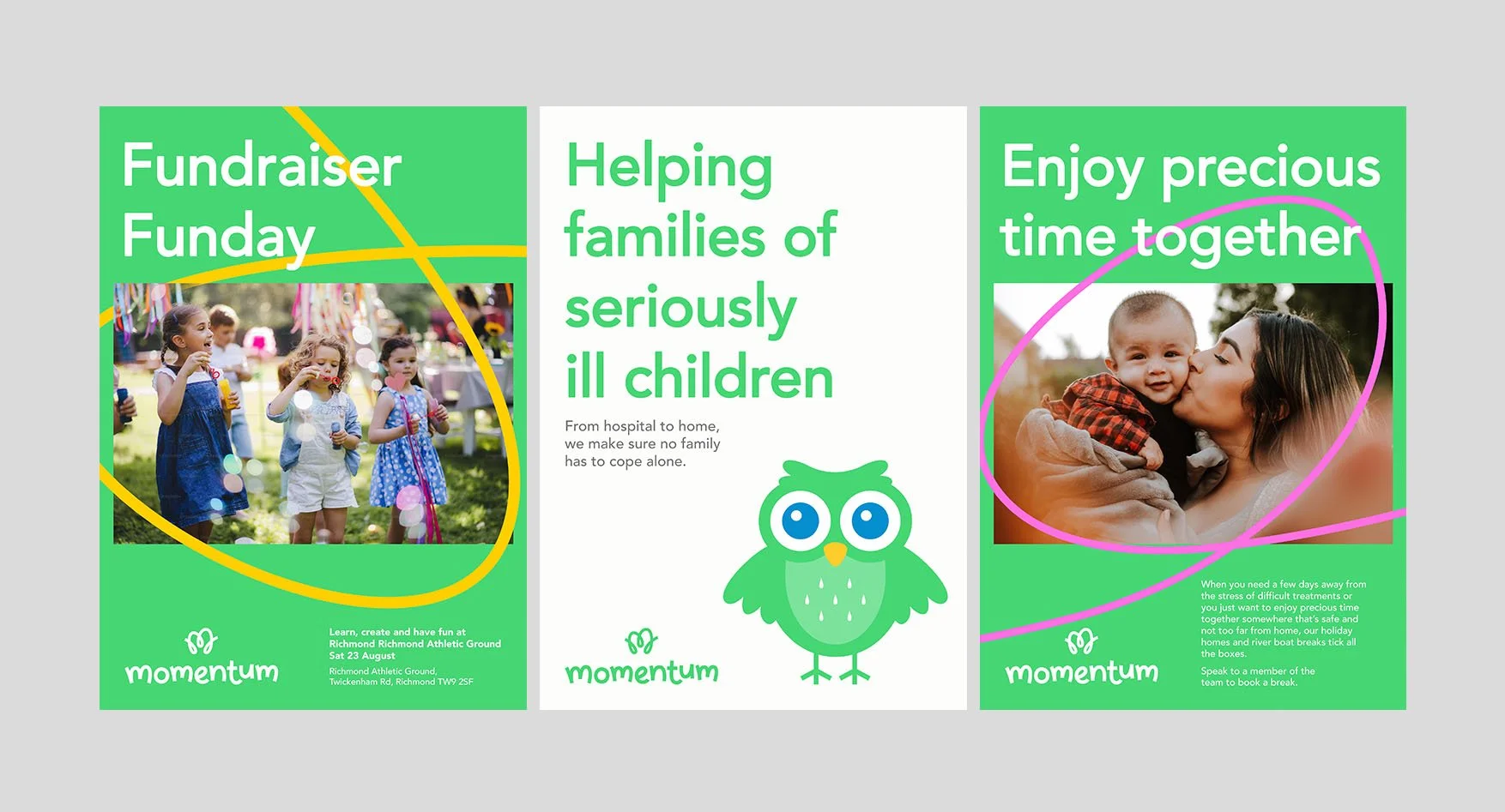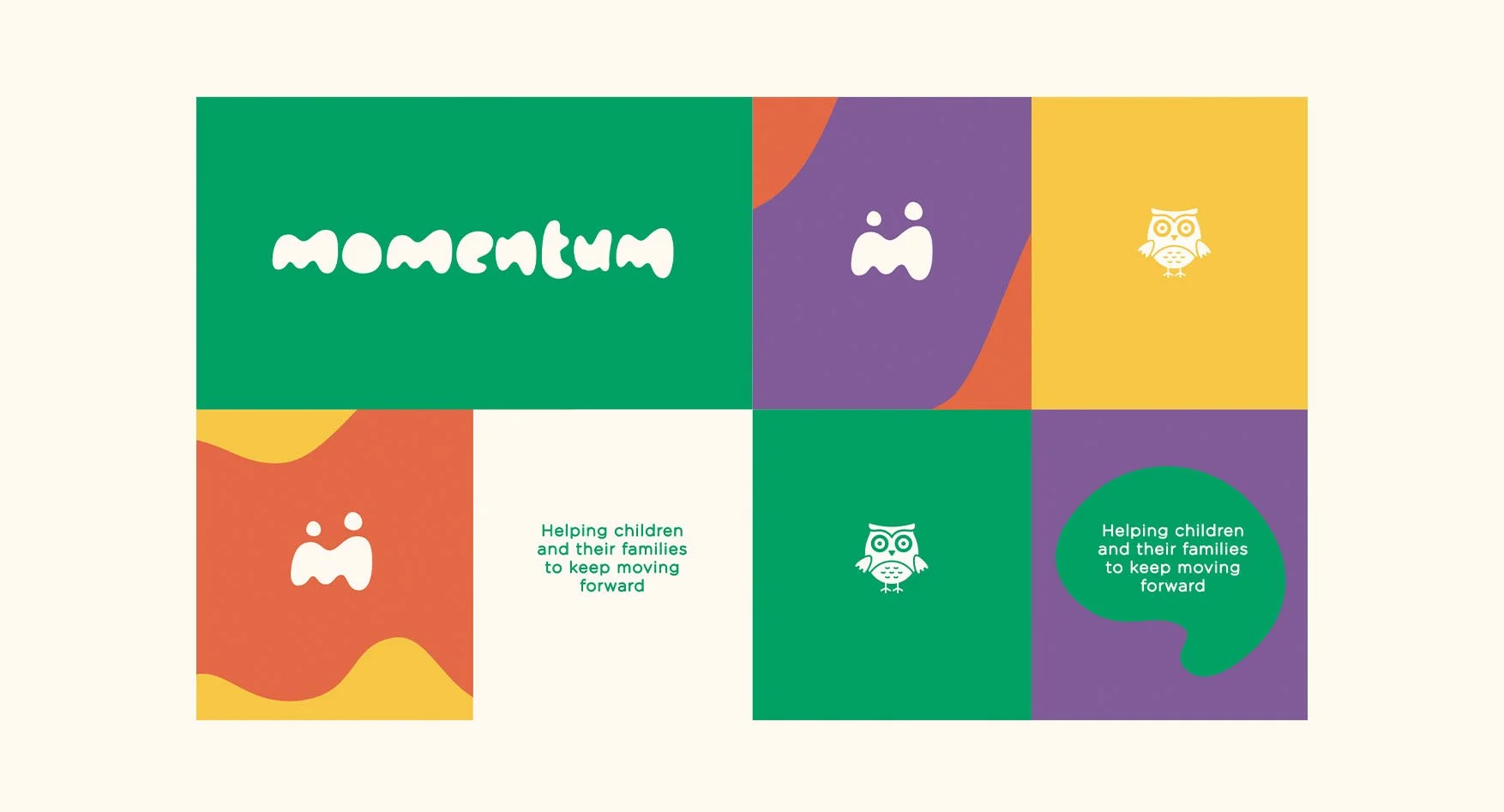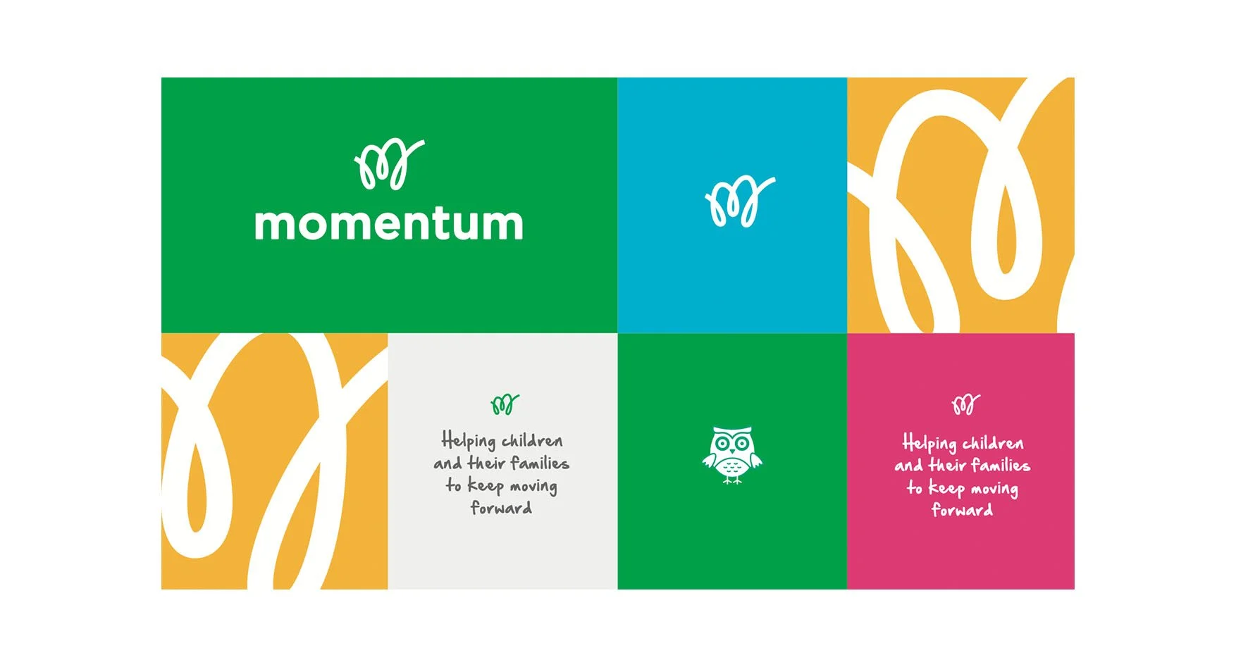 The design approach was all about respectful positivity. The line work of the M logo mark is inspired by motion and the sense that a journey has twits and turns and is not a linear thing. Match with a rounded friendly word mark the design had a fresh youthful look that stayed away from being overly kiddy. Mo the owl was a progression of an icon they had inspired by the owls in the first at Momentum retreats. He gives an extra layer to the approachable tone.